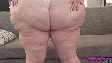 Julie comes down the stairs and shows off every curve and she seductively walks to the couch, twerking and then grabbing her big black dildo to play with. She rides it, shaking her huge booty for the camera.