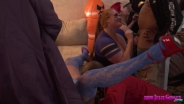 Julie and her two sexy friends, Taylor Nicole and Betty are home, waiting on trick or treaters to show up. When the guys show up in costume and are looking for candy, they realize they are all out and invite them inside for a treat they didn't expect! This interracial orgy is super hot and fun! Happy Halloween!